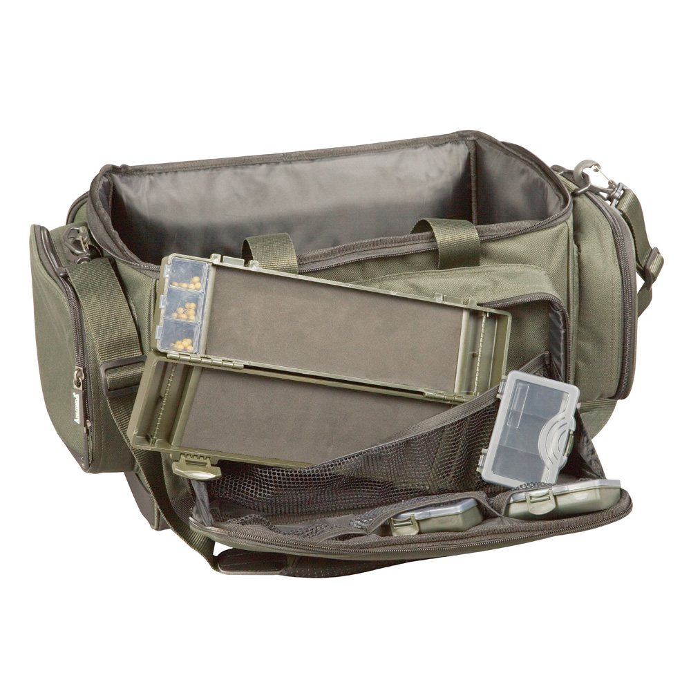 An Funktionalität ist diese Tasche kaum zu überbieten. So ist der Deckel der Tasche extrem versteift und an den Seiten erhöht, sodass dieser als Bivy Table verwendet werden kann. Im Inneren des Gear Tray befinden sich gepolsterte Trennwände, die mittels Klettverschluss eine individuelle Einteilung der Tasche ermöglichen. Zusätzlich kann sie problemlos noch eine Tackle Chest Large aufnehmen. Als ganz besonderes Feature sei bei dieser Tasche anzumerken, dass sich in der aufgesetzten Fronttasche, perfekt in Netztaschen angeordnet, ein im Lieferumfang enthaltener Rig Carrier, sowie je eine ST-Chest1, 2 & 3, befinden. Weiterhin verfügt der Gear Tray über zwei aufgesetzte Seitentaschen, zwei seitliche Trageriemen, einen gepolsterten Schultergurt und natürlich einen schmutzabweisenden Kunststoffboden. • Außenmaße: 56 x 40 x 31 cm • Material: 600D Nylon • Wasserabweisendes PVC Coating • Im Lieferumfang enthalten: Rig Carrier, ST-Chest 1, ST-Chest 2, ST-Chest 3