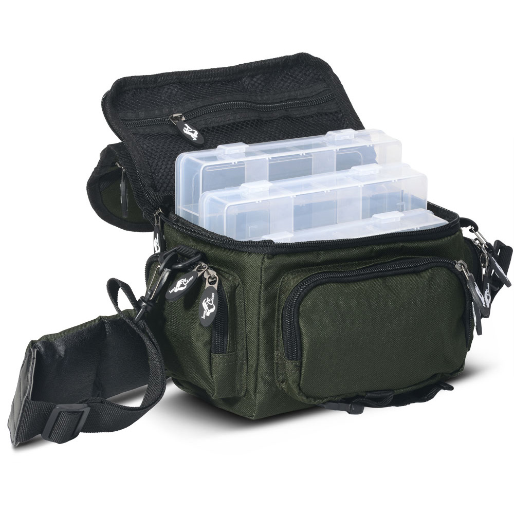 Wenn man am Forellenbach oder mit extrem leichten Gepäck zum Barschfischen unterwegs ist, aber trotzdem viele Köder und Zubehör zu verstauen hat, braucht man einen Kumpel, der alles trägt, was man in einer solchen Situation eben braucht. Genau das ist unser Buddy Bag. Im Hauptfach sind drei Tackle Boxen untergebracht. Weiterhin sind drei Außentaschen angebracht, welche alle möglichen Kleinteile beherbergen können. Zusätzlich gibt es noch Stauraum in einem Deckelfach. Das ganze lässt sich bequem mit einem stark gepolsterten Schultergurt tragen und durch die angebrachten Gürtelschlaufen noch zusätzlich sichern. Außenmaße (B x H x T): 30 x 16 x 18 cm • Material: 600D Nylon • injkl. Boxen: 3 Stk. 20 x 13 x 4 cm • Passende Gear Box: Typ 1