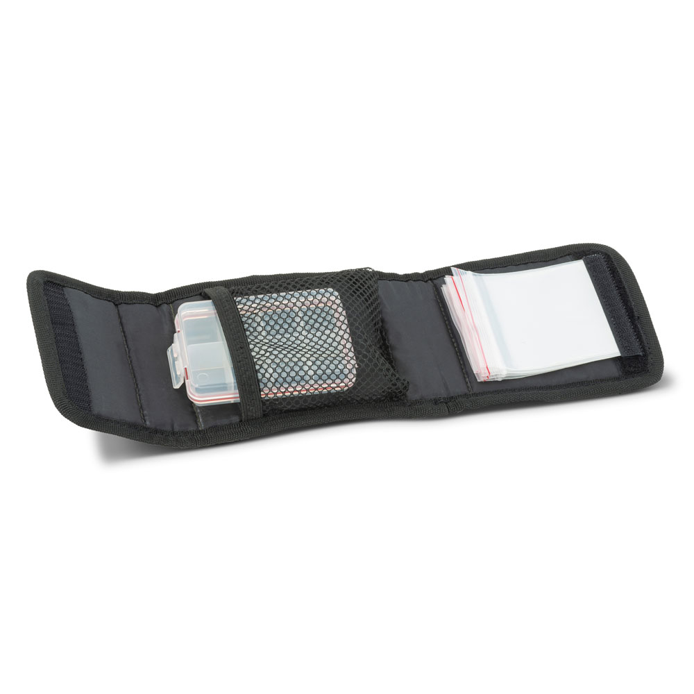 Zweckmäßiges Wallet zur Aufnahme von z.B. Spinnvorfächern. Auf einer Seite mit 5 Klarsichthüllen ausgestattet und inkl. einer Box, welche sich durch ihre Unterteilung hervorragend dazu eignet, Kleinteile wie Wirbel, Quetschhülsen etc. aufzunehmen.