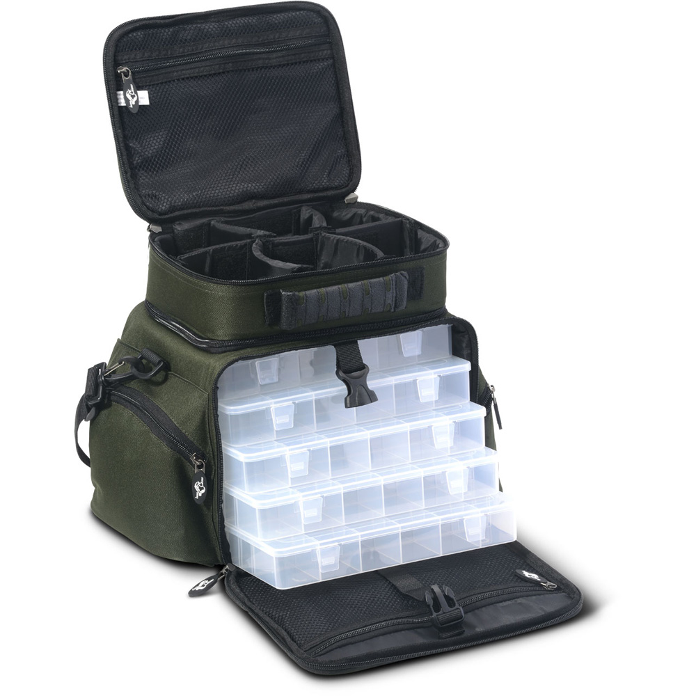 Eine Tasche mit fünf Tackleboxen der Größe 25,5 x 18,5 x 4 cm. Der Lure Container lässt sich prima einsetzen, wenn man etwas größere Kunstköder zu transportieren hat. In den zwei außen angebrachten Taschen finden diverse Utensilien ihren Platz. Die mittels eines Reißverschlusses abnehmbare Tasche auf der Oberseite ist innen mit einer durch Klettbefestigungen individuell gestaltbarer Einteilung versehen. Auf der Rückseite und in allen durch Reißverschluss zu öffnenden Deckeln befinden sich Netztaschen. Durch den Schultergurt lässt sich die Tasche einfach und komfortabel transportieren. • Außenmaße (B x H x T): 43 x 34 x 24 cm • Boxen: 5 Stk. 25,5 x 18,5 x 4 cm • Material: 600D Nylon • passende Gear Box: Typ 2