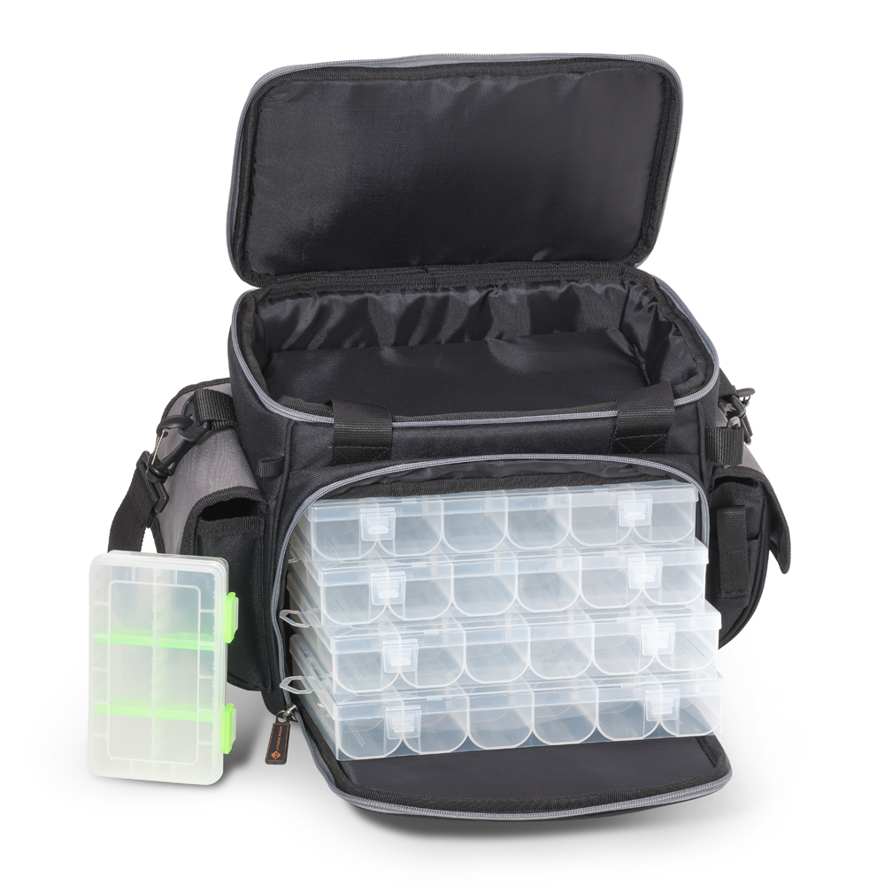Die Basistasche am Forellensee mit einer großen Vielfalt an Verstaumöglichkeiten. Ursprünglich war diese Tasche als mobiles Lager für das Angeln mit Spoons gedacht, daher auch der Name. Dafür ist sie natürlich auch hervorragend geeignet, macht aber auch bei vielen anderen Anwendungen eine super Figur. Geliefert wird die Spooner Base inkl. 6 Boxen. Vier davon (Maße: 27 x 18 x 4 cm) finden sich im von vorne zugänglichen Hauptfach und zwei weitere (Maße: 15 x 9 x 4 cm) sind in den aufgesetzten Seitentaschen untergebracht. Im geräumigen Deckelfach lässt sich z.B. das Spooner Wallet (Art.Nr. 7160 140, nicht im Lieferumfang) verstauen. Auf der Vorderseite ist noch eine zusätzliche Außentasche, ein Zangenhalter und Gummischlaufen angebracht. Durch den Schultergurt und die Tragegriffe lässt sich die Tasche und deren Inhalt bequem transportieren.