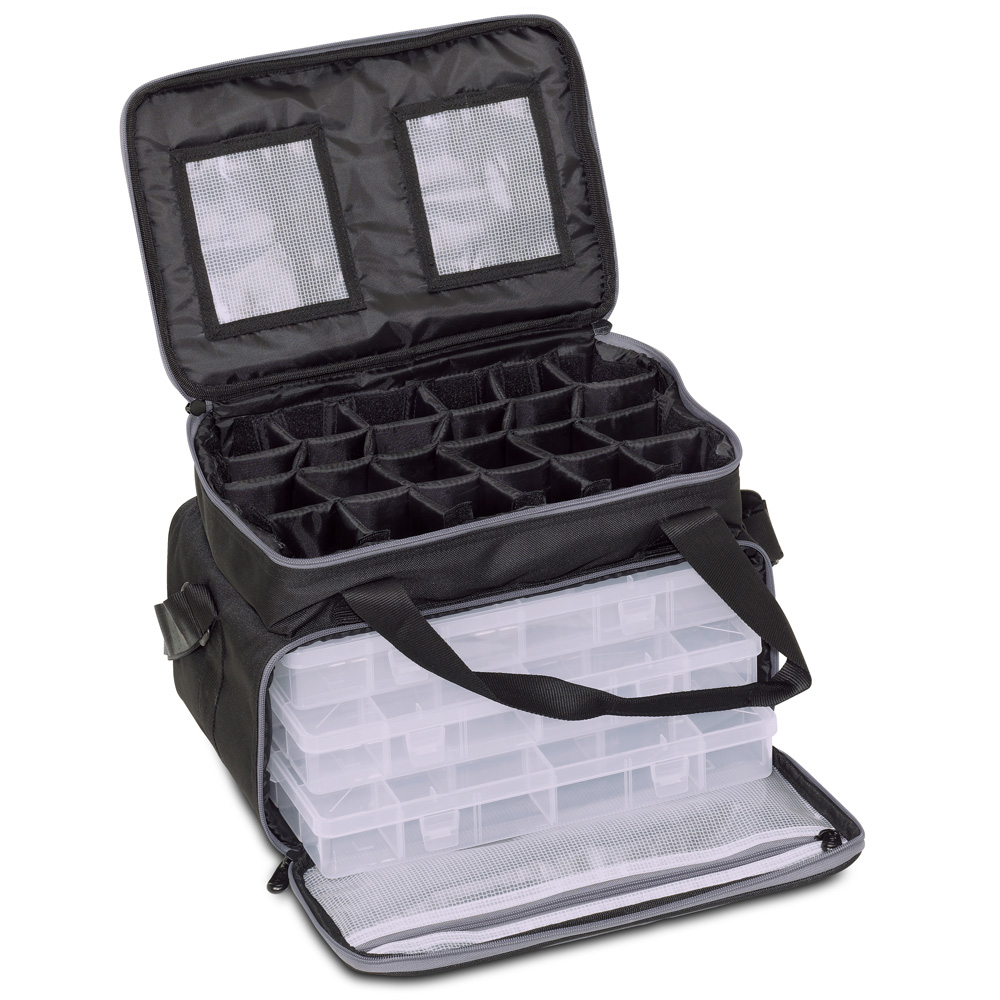 Sehr praktisch und genau auf die Bedürfnisse am Forellenteich zugeschnitten - das ist die im Hauptfach mit drei Gerätekisten der Größe 35 x 22 x 5 cm ausgestattete Trout Bag I. Im Deckelfach finden sich sage und schreibe 24 Unterteilungen, die mittels Klettband eingesetzt sind und genau für Forellenteiggläser ausgelegt wurden. So ist die Ordnung garantiert! • Maße: 38 x 24 x 24 cm • 1 große Zubehörtasche mit 24 gepolsterten Fächern zur Aufnahme von Forellenteiggläsern • Lieferung ohne Inhalt