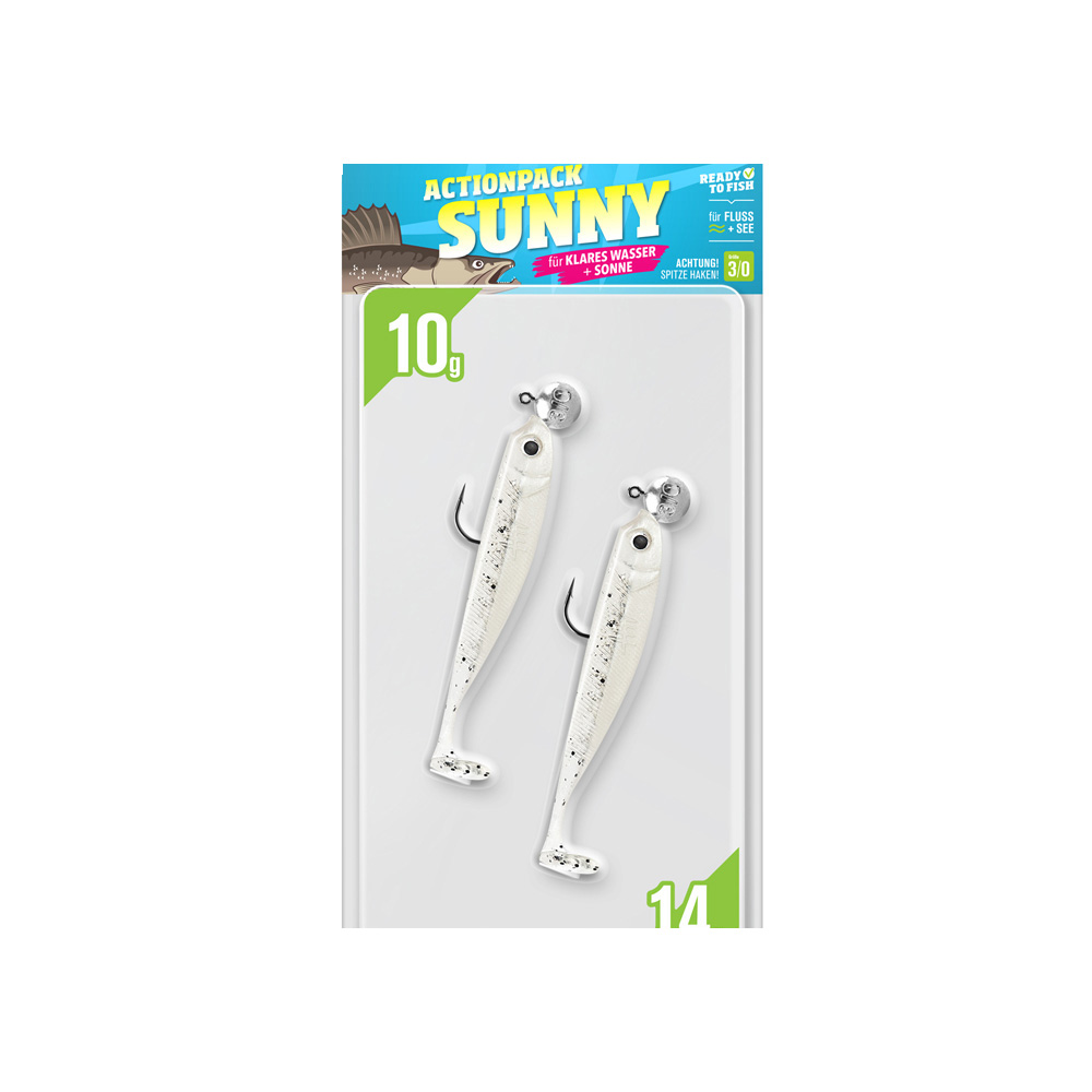 Mit dem Lieblingsköder Actionpack könnt ihr direkt anfangen zu fischen. Die Actionpacks enthalten zwei Gummiköder, die bereits am Jighaken montiert sind. Ein Köder ist für stehendes Gewässer mit 10g Jigkopf und ein für fließendes Gewässer mit 14g Jigkopf.