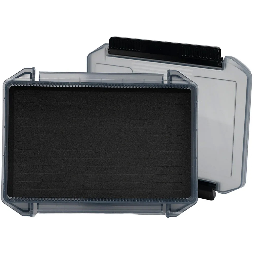 Die LMAB Tackle Box Jig & Rig ist eine in verschiedenen Versionen erhältliche Tackle Box für die Aufbewahrung von Skirted Jigs, Bladed Jigs, Shallow Rigs und Stinger. Diese Boxen haben ein großes Hauptfach mit einer geschlitzten EVA-Schaum-Einlage, in welche die Haken gedrückt werden. Das Material der Box ist hochwertiger, rauchig-grauer Kunststoff, welcher einen UV-Schutz für den Inhalt bietet. Sichere Scharnierverschlüsse sorgen dafür, dass die Boxen geschlossen bleiben, lassen sich aber bei Bedarf einfach öffnen. Je nach Variante haben die Boxen entweder eine Scharnier-Verschlussleiste oder normale Scharnier-Verschlüsse.