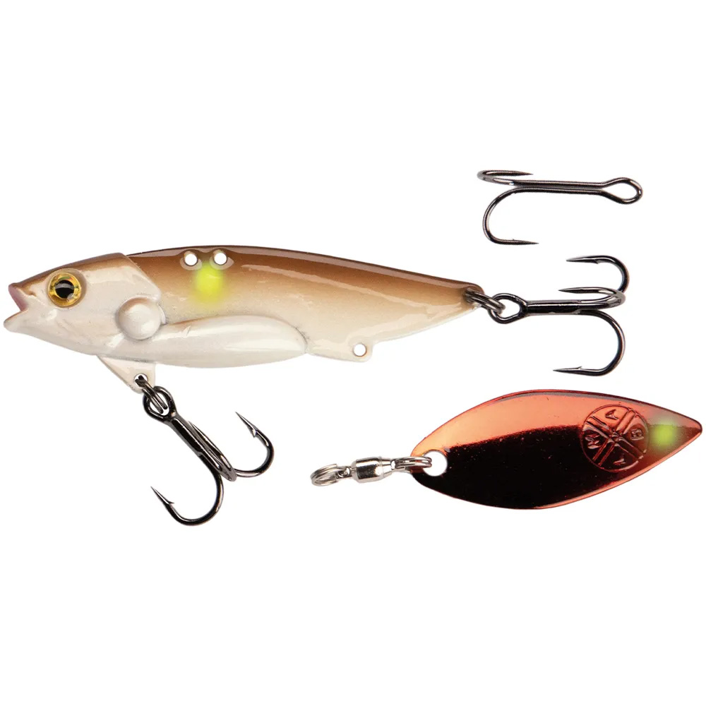 Der LMAB KØFI Techno Vibe ist ein Vibration-Blade mit der Möglichkeit zur Variation. Er wird inklusive einem Austausch-Zwillingshaken und einem Willow Blade geliefert. Durch den Austausch des vorderen Drillings gegen den Zwillingshaken kann man an schwierigen Spots die Hängergefahr reduzieren. Die Montage des Willow Blades anstelle des hinteren Drillings verleiht dem Techno Vibe noch mehr Aktion. Neben der beeindruckenden Aktion überzeugt er auch mit dem Sound, der aus der Rasselkammer hinter dem Kopf stammt. Um die Aktion zu beeinflussen, hat der Techno Vibe zwei Befestigungsoptionen am Rücken. Wenn vorne befestigt, zeigt er dezente Vibrationen, hinten befestigt werden die Vibrationen deutlich stärker und intensiver. Perfekt, um sich der Laune der Fische anzupassen.