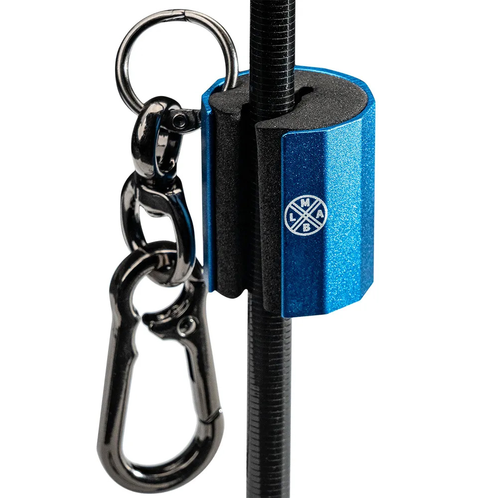 Köderwechsel und Fisch abhaken, nur um 2 Gründe zu nennen, wo es praktisch ist, wenn beide Hände frei sind. Wenn die Rute auf dem Boden abgelegt wird, beinhaltet das immer das Risiko von Beschädigungen wie Kratzern am Blank und Rolle oder gar schlimmeres. Abhilfe schafft da der LMAB Rod Holding Clip. Dies ist ein an der Seite offenes, kurzes Stück Rohr aus eloxiertem Aluminium in einem sehr schicken Blau mit silbernen LMAB-Logo. Das Rohr ist mit Schaumstoff ausgepolstert und mit einem Karabiner versehen. Dank diesem kann der LMAB Rod Holding Clip am Gürtel oder an der Tasche festgemacht werden, immer in Griffweite und perfekt positioniert, um die Rute aufzunehmen. Denn diese wird in den Clip gedrückt und wird vom Schaumstoff sanft, aber sicher gehalten. So hat man die Hände frei und hat sogar im Wasser watend eine Möglichkeit die Rute aus den Händen zu legen.