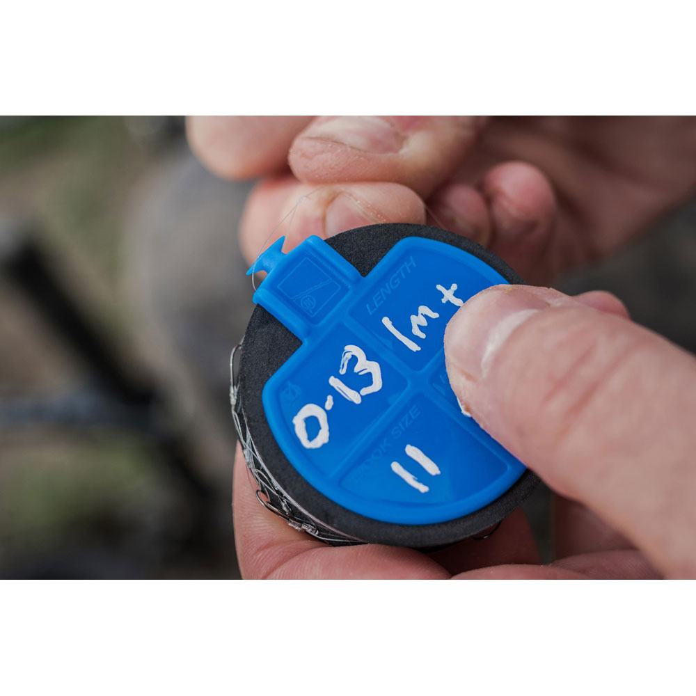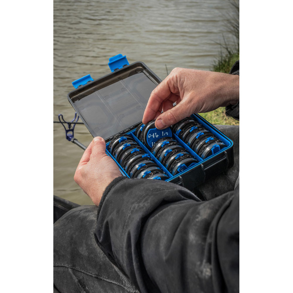 Das Revalution Speichersystem ist ein Spulensystem mit einem Unterschied - EVA-Spulen sind die beste Möglichkeit, lange Vorfächer aufzubewahren, aber nun benötigen sie keine extra Stifte mehr, da es einen rotierenden Kunststoffstift gibt. Auf der Spule befindet sich ein Bereich, der für eine einfache Identifikation des Vorfachs gedacht ist. Die Vorfachlänge, der Schnurdurchmesser, der Hakentyp und die Größe können dort notiert werden. 21 Spulen werden mit einer Aufbewahrungsbox geliefert, die über einen teilweise transparenten Deckel verfügt, um den Lichteinfall in die Box zu reduzieren. Aufkleber können auf der Innenseite des Deckels zur schnelleren Identifikation angebracht werden.