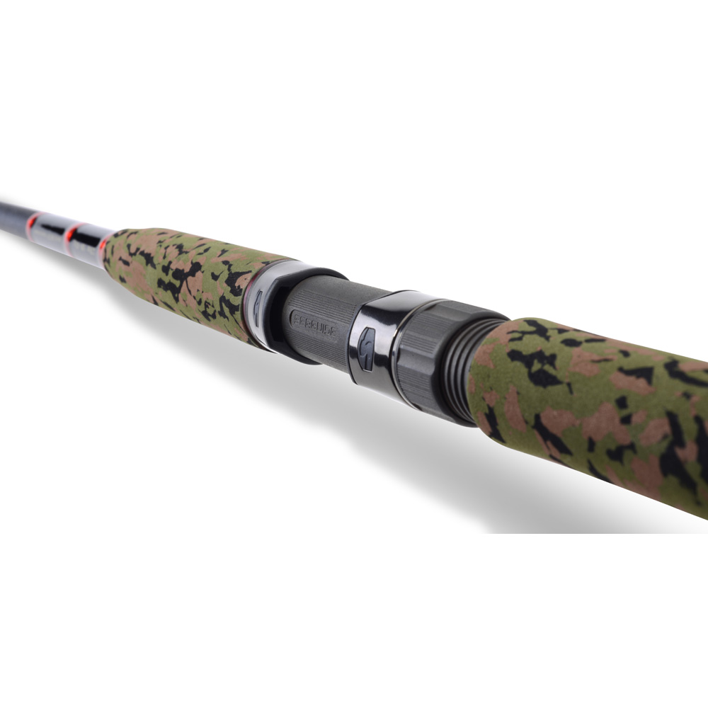 Die Uni Cat Destroyer Serie ist mittlerweile ein Begriff in der Szene, der kraftvolle Carbon Composite Blank ist schier unverwüstlich. Durch die enorme Power und die sehr angenehme Aktion, bietet die Destroyer die nötige Sicherheit bei brachialen Drills und kniffligen Situationen auf Großwaller. Das Handteil mit dem formschönen Moosgummigriff im Camouflage Design, sorgt dafür, dass man jederzeit die Kontrolle über den Fisch behält. Ausgestattet ist die Rute mit einem sehr hochwertigem Sea Guide SCXDPS Rollenhalter.