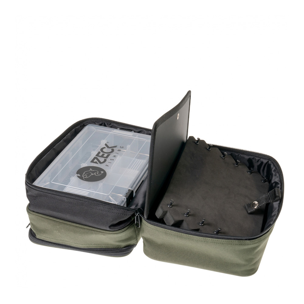 Der Zeck Rig Bag Pro ist eine Tasche zum Verstauen von Kleinteilen, Vorfachmaterial, Werkzeug und fertig gebundenen Vorfächern. Auf der einen Seite ist mittels Klettverschlusses eine wasserdichte Tackle Box WP (M) fixiert. Auf der gegenüberliegenden Seite befindet sich ein EVA Board mit Stiften für die Fixierung der Vorfächer.